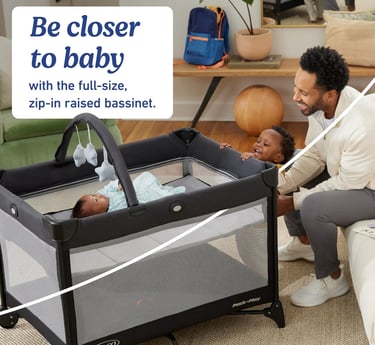 Graco On The Go Zip DLX Pack ‘n Play Playard, Folding Playpen with Bassinet, Portable Crib
